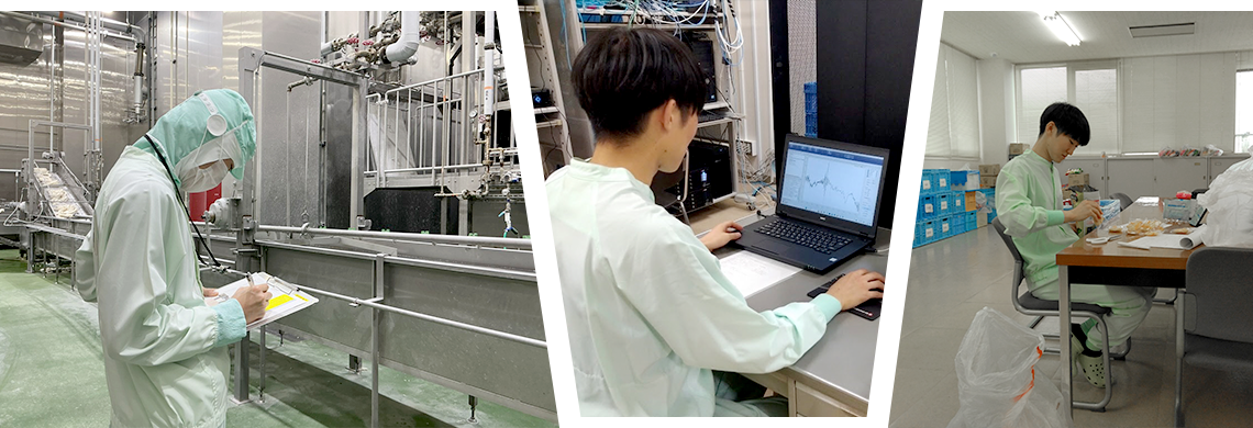 名前の通り製品の品質を保証する職種です。具体的には、出荷判定と呼ばれる前の日に作った商品の食味チェックや包装状態の確認、製造記録の確認を行い出荷の判断を行います。また、新商品などの食品表示のチェックを他部署と連携して行います。お客様からくるお申し出に対して現場と一緒になって、原因の調査と対策の実施を行っています。その他にも、油や細菌、アレルゲンの定期検査も行っています。